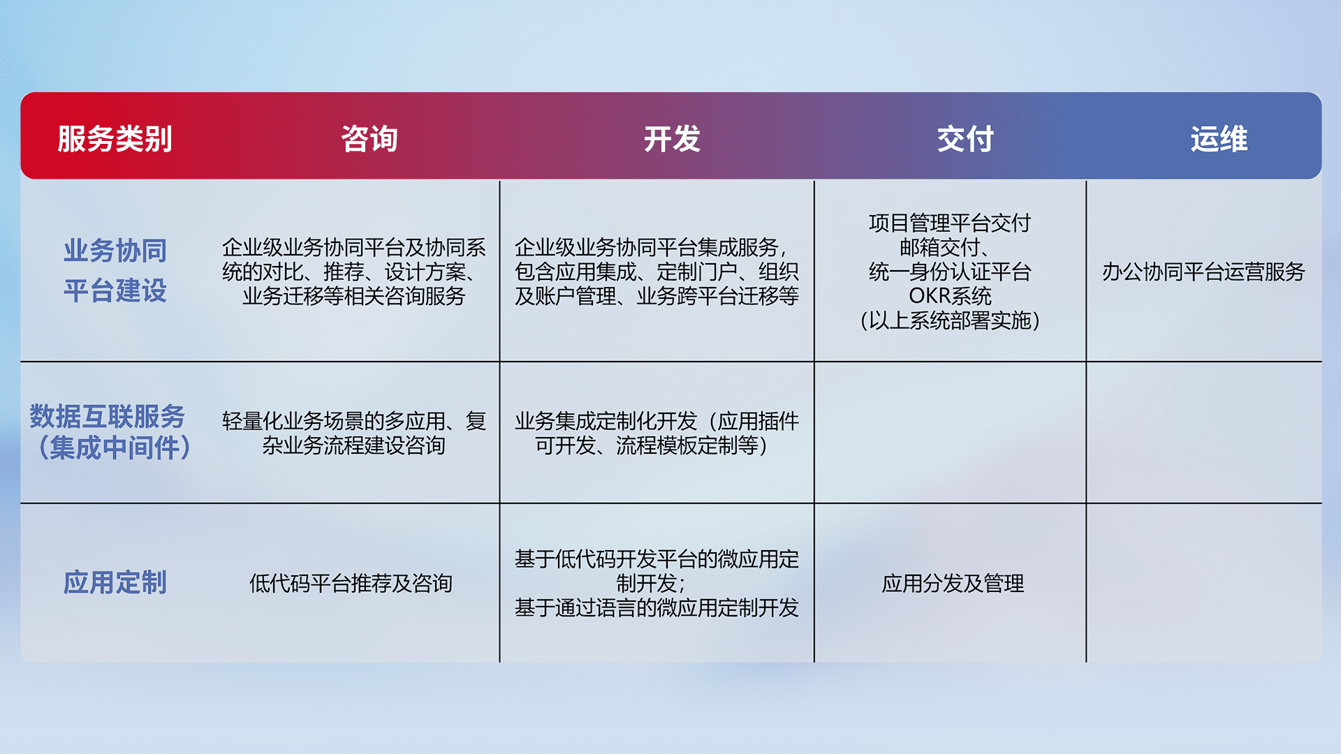 针对钉钉、、企微、、IDaas等平台级产品提供产品的规划、、、、方案、、交付、、定制化开发等服务,,实现如统一协同办公、、智能客户服务、、、、混合会议管理、、、智能数据查询、、、、等业务场景,,,,实现数字化转型。。