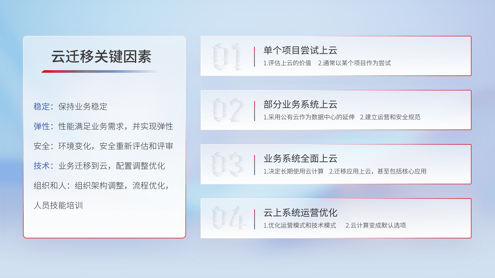 结合实际业务,,,从规划设计、、、云平台选型、、、云原生改造、、、数据迁移、、、、集成交付,,迁移全过程为客户识别最佳上云路径,,,做好风险识别管理,,,设计网络架构、、身份权限、、安全审计合规、、、、操作审计、、、日志审计、、监控告警策略、、多站点容灾设计等,,,,对云上基础设施进行整体规划,,,提升IT治理水平,,以满足弹性、、、、高可用、、、高性能的需求。。。