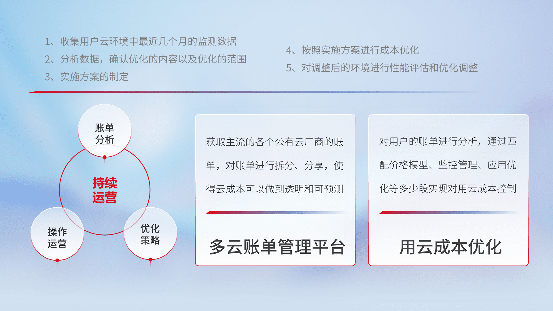 通过多云纳管,,,以统一的资源数据模型把客户的云资源进行抽象和封装,,,进而实现对多云资源的统一操作,,,,保障云资源管理的可靠性、、稳定性与可用性。。。量身定制化运维内容,,,配置、、、开发运维、、补丁管理、、、备份、、、监控、、认证和访问管理、、、、审计和日常巡检等,,保障在用云过程中的可靠度,,稳定度以及高可用率。。。